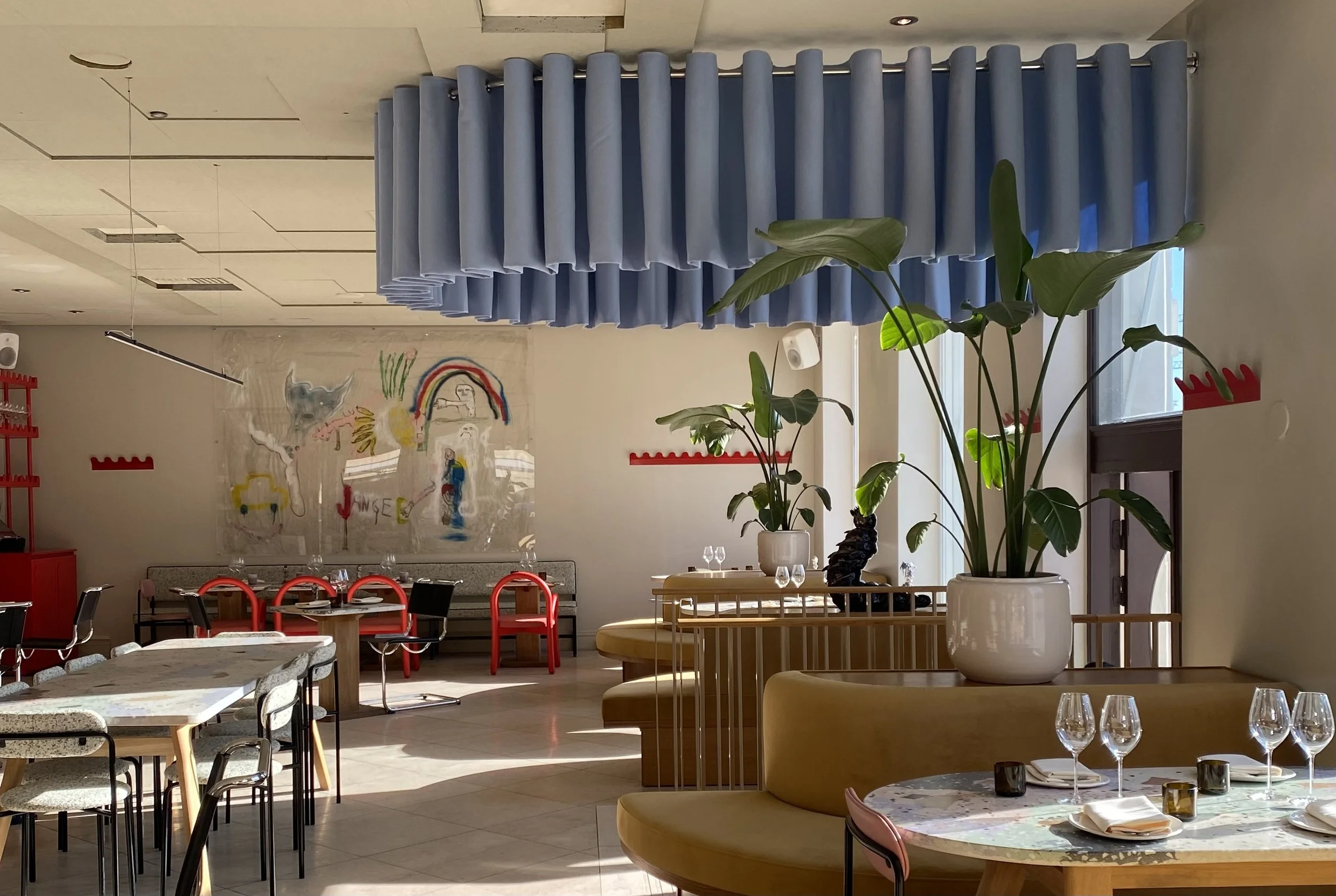 Ravintola verhot ja metallirunkoiset sohvat.